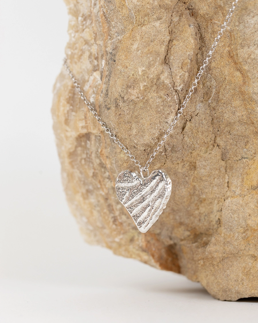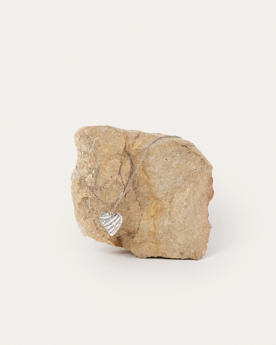 El Collar Corazón de Tierra honra las huellas que dejan los procesos vitales. Su superficie elaborada con una textura rugosa refleja los caminos recorridos, los relieves y surcos que forman parte de nuestra historia. En su imperfección se revela la belleza de lo vivido, la sabiduría del tiempo, la ternura que brota de la vulnerabilidad. Creado en plata, metal vinculado a la intuición y la receptividad, este corazón es símbolo de amor maduro: firme, enraizado y honesto.