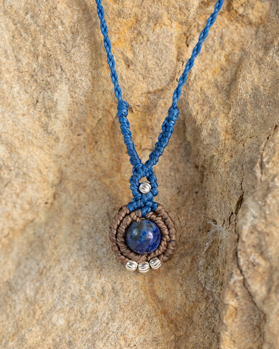 Cada hilo tejido es una intención de equilibrio, un recordatorio de que el movimiento más sereno es también el más poderoso. El azul simboliza la comunicación consciente y la confianza en la propia voz interior, mientras la piedra azul canaliza intuición y serenidad. Es una joya para quienes desean reconectar con su visión, su palabra y su intuición.
