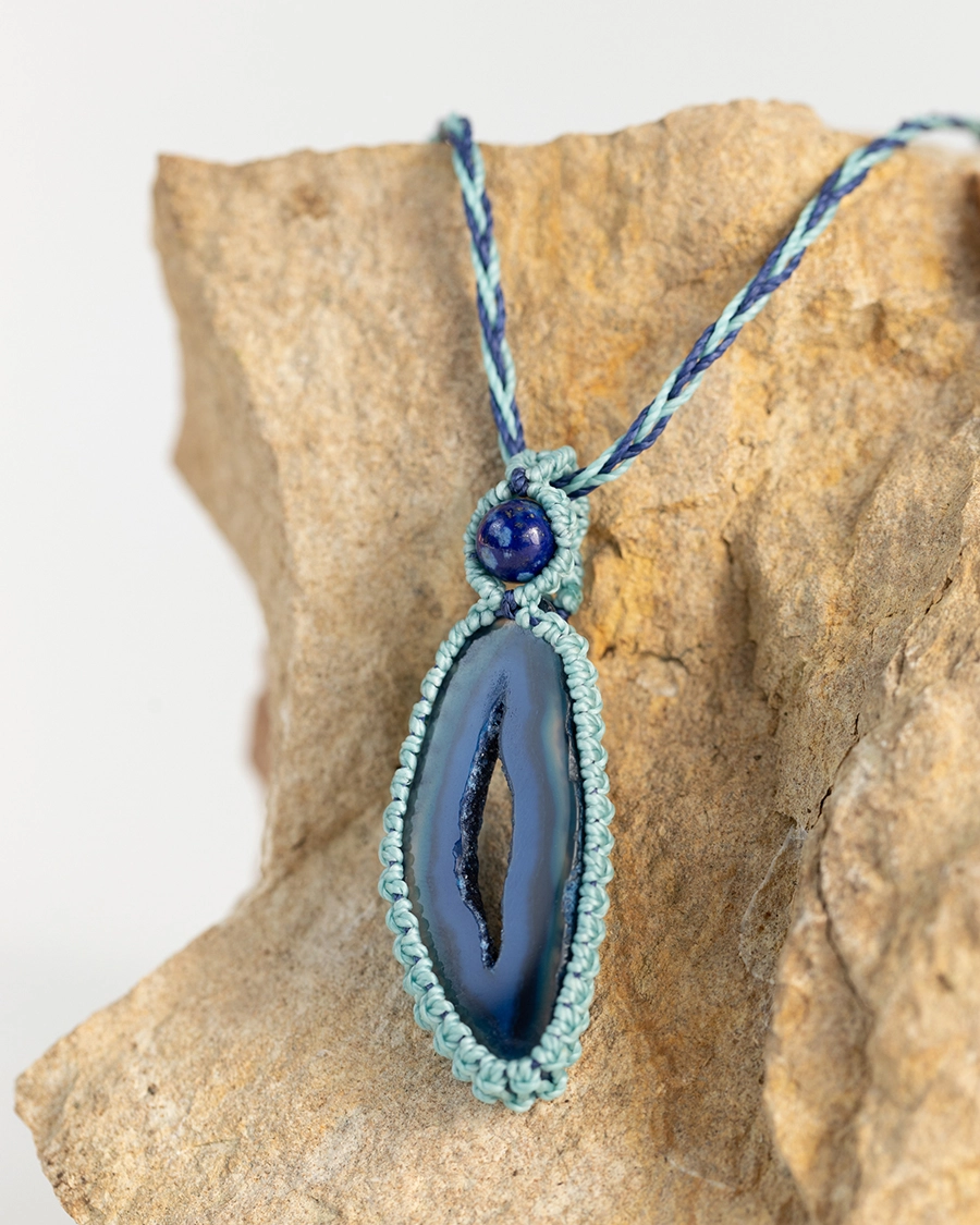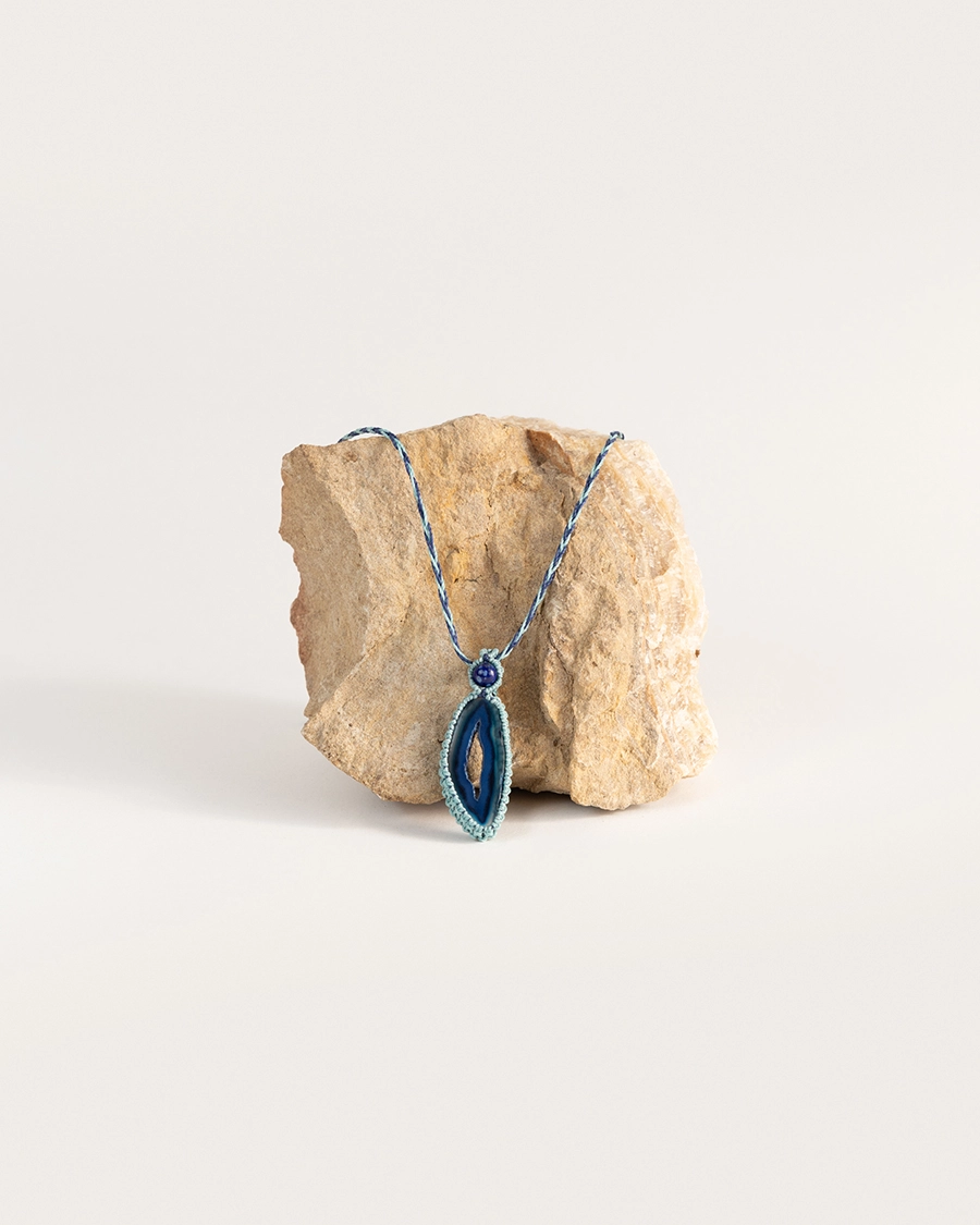 El Collar Portal Azul representa el paso entre el silencio y la voz, entre lo invisible y lo expresado. El ágata azul, con su forma orgánica y su brillo translúcido, actúa como un ojo protector que invita a la introspección y a la confianza en la propia verdad. El tejido en tonos azules y turquesas envuelve la piedra como si fuera una ola, símbolo de movimiento y expresión fluida. Cada nudo del macramé está hecho con presencia, recordando que la verdadera comunicación nace del centro, no del ruido. Es una joya para quienes buscan hablar desde el alma y caminar con la serenidad del agua.