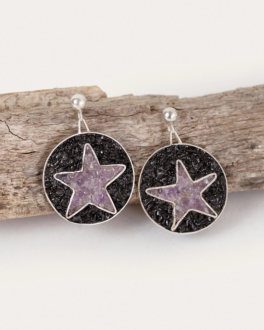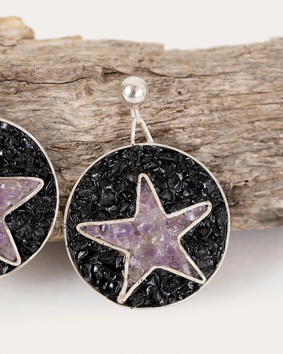 Los Pendientes Cielo de Medianoche evocan el instante en que el cielo nocturno se abre y las estrellas revelan su resplandor. El fondo oscuro simboliza el misterio y la profundidad interior.La estrella de amatista, incrustada con sutileza, representa la claridad, la intuición y la guía espiritual. Son una invitación a recordar que la luz siempre está presente, incluso en los momentos más oscuros. Una pieza que conecta con la energía del universo, con la belleza de lo invisible y la fuerza de lo que se transforma.